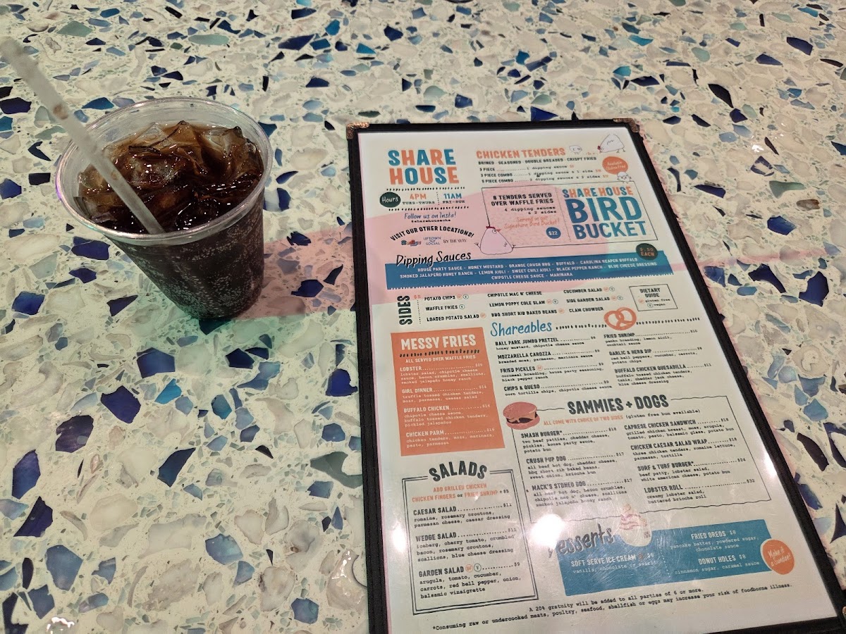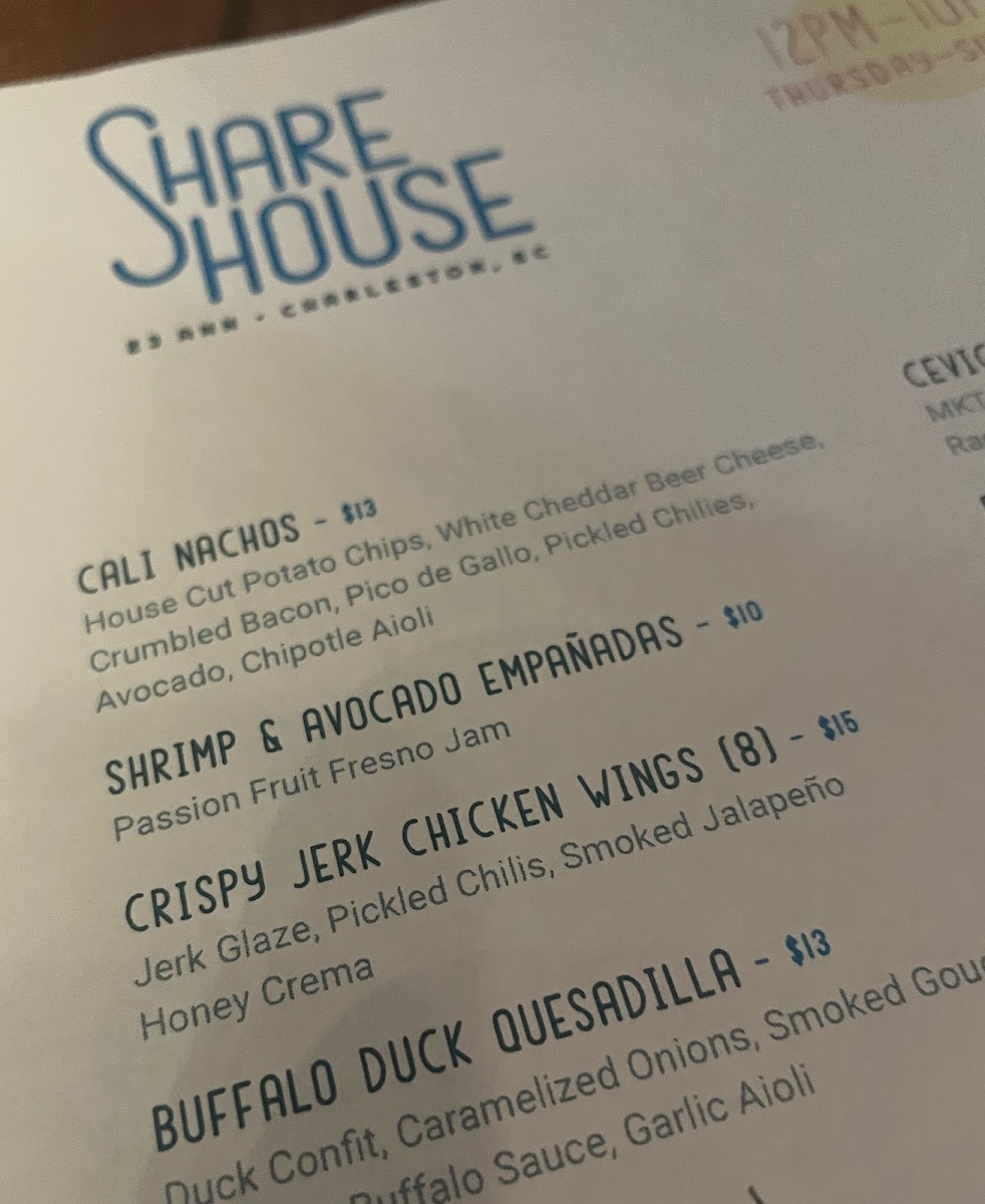 From a reviewer's perspective, Share House on 23 Ann St in Charleston delivers a menu that blends casual comfort with playful indulgence. The sides such as Side BBQ Short Rib Beans, Side Lemon Poppy Cole Slaw, Side Potato Chips, Side Fries, and Side Clam Chowder provide simple but satisfying accompaniments, each bringing its own flavor to complement the main dishes. For those seeking messy fries, the selections like Lobster Fries, Buffalo Chicken Fries, Girl Dinner Fries, and Chicken Parm Fries offer generous, loaded portions that are perfect for sharing or indulging solo. Salads including Wedge Salad, Garden Salad, and Caesar Salad offer lighter, refreshing options amid the hearty fare. The sammies & dogs lineup is equally enticing, featuring items like the Crush Pup Dog, Chicken Caesar Salad Wrap, Chicken Caprese Sandwich, Smash Burger, and Surf And Turf Burger, demonstrating a balance between classic favorites and inventive combinations. Chicken tenders are available in versatile options with the Bird Bucket, 3 Piece Combo, 3 Piece Tenders, and 5 Piece Combo, catering to both solo diners and groups. Shareables such as the Buffalo Chicken Quesadilla, Fried Pickles, Fried Shrimp, Ball Park Jumbo Pretzel, and Chips & Salsa round out the menu, emphasizing the restaurant’s social, casual dining vibe. Desserts like Fried Oreos and Donut Holes provide a playful, sweet finish to any meal. Overall, the menu at Share House balances hearty, indulgent comfort food with lighter, sharable options, making it a versatile choice for a range of tastes and dining moods.